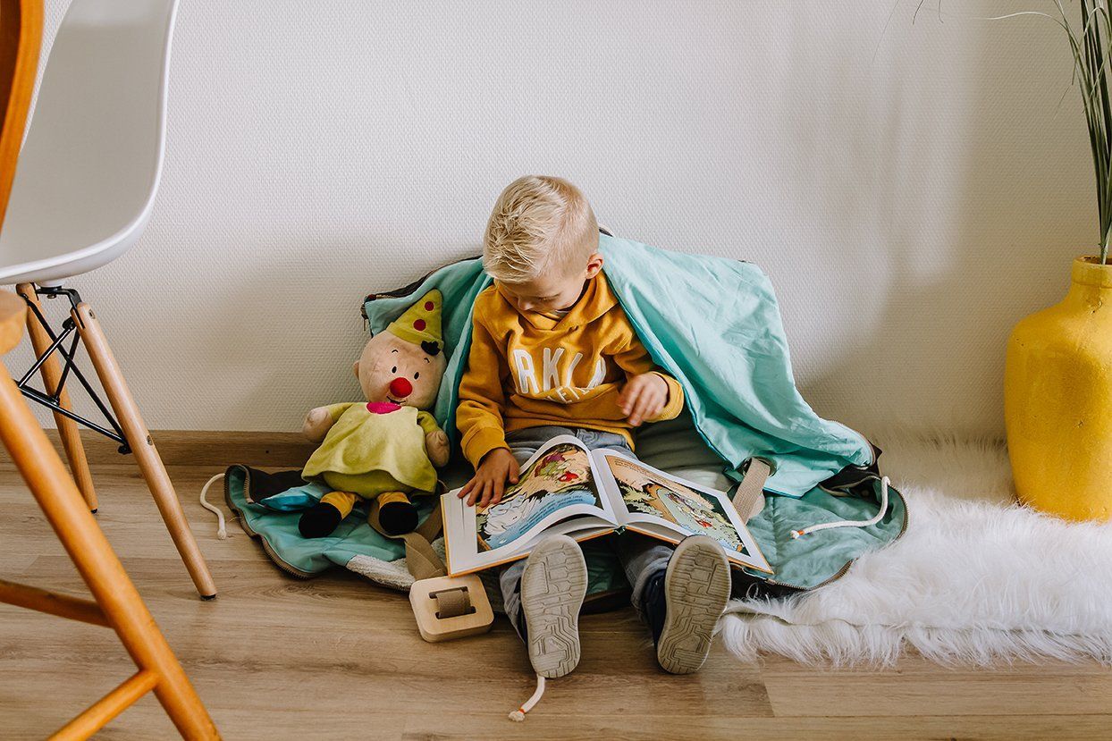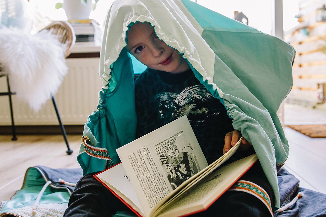 Gaat het kind zelf (leren) lezen? Dan kan het kind in een handomdraai een tent, een verstopjas met capuchon of een zitzak van Het Leesdoek maken met de meegeleverde aanritsbare elementen.